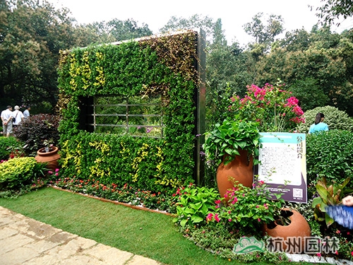 走進畫境園,只見主入口左側種植著兩株一高一矮的厚皮香樹,郭昌如笑著說,“這兩棵厚皮香寓意的是兩個萬分自豪的森林衛(wèi)士——熊大和熊二,你看,熊二還滿臉熱情地向游人不停地招手示意呢。”主入口右側是一面立體綠植墻,所用的植物主要為黃金絡石、金寶石冬青、小葉梔子花、金邊黃楊等?!傲Ⅲw綠植墻是立體綠化的主要形式,畫境?青山湖花園中心推出的這款立體綠植墻產品,可以根據客戶需要,結合氣候、溫度、濕度、色彩等綜合條件,選配四季長綠或色彩豐富的植物,隨時在人們想要的地方構建出一個貼近自然又超脫自然的生活環(huán)境,可謂是簡單又方便?!惫缃榻B道。立體綠墻的兩側,隨意地散落著一些紅陶罐,與金寶石冬青、龜甲冬青等精品球形植物,三角梅、月季、常春花、雞冠花等花卉,紫葉狼尾草、晨光芒、矮蒲葦等觀賞草混搭,營造出一種溫暖、和煦的庭院景觀?!叭绻丫G植墻看成是城市的建筑,此景則喻意美麗杭城的繁華一角。”郭昌如補充說。綠植墻的中間還別出心裁地設置了一扇窗戶,透過它,園內的美景已隱約可見。
