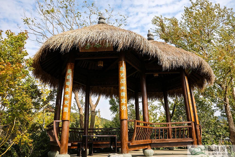 走出湖畔居,沿著山石小道拾級而上,來到“問茶”展區(qū)。伴著翠綠的茶葉和淡淡的茶香,登上杭州園的制高點——茅草雙亭。茅草雙亭有兩塊匾額,一塊是“問茶”,一塊是“聽泉”?!皢柌柰ぁ闭胺降膸字瓴铇涫遣鑸@的點睛之筆,設(shè)計靈感取自“西湖龍井十八棵御茶”。在亭子邊還有一處泉眼——“滌心”,“滌心”是乾隆皇帝御題的“龍井八景”之一,寓意溪水清澈,心靈清凈。