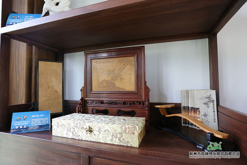 在以浙派民居為風(fēng)格的主題建筑“富春山居”內(nèi),展示著來自仙居的無骨花燈、溫嶺的石雕、黃巖的翻簧竹雕、椒江的臺州玻雕、臺州刺繡等精美的展品。